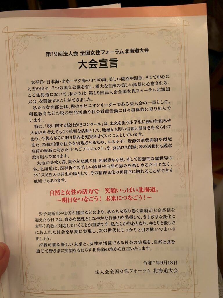 「自然と女性の活力で笑顔一杯北海道」をスローガンとして、税知識の啓蒙活動はもとより、持続可能な社会を実現させるため、環境負荷を軽減に向けた「いちごプロジェクト」や「食品ロス削減」などの活動にも鋭意取り組むことが宣言されました。