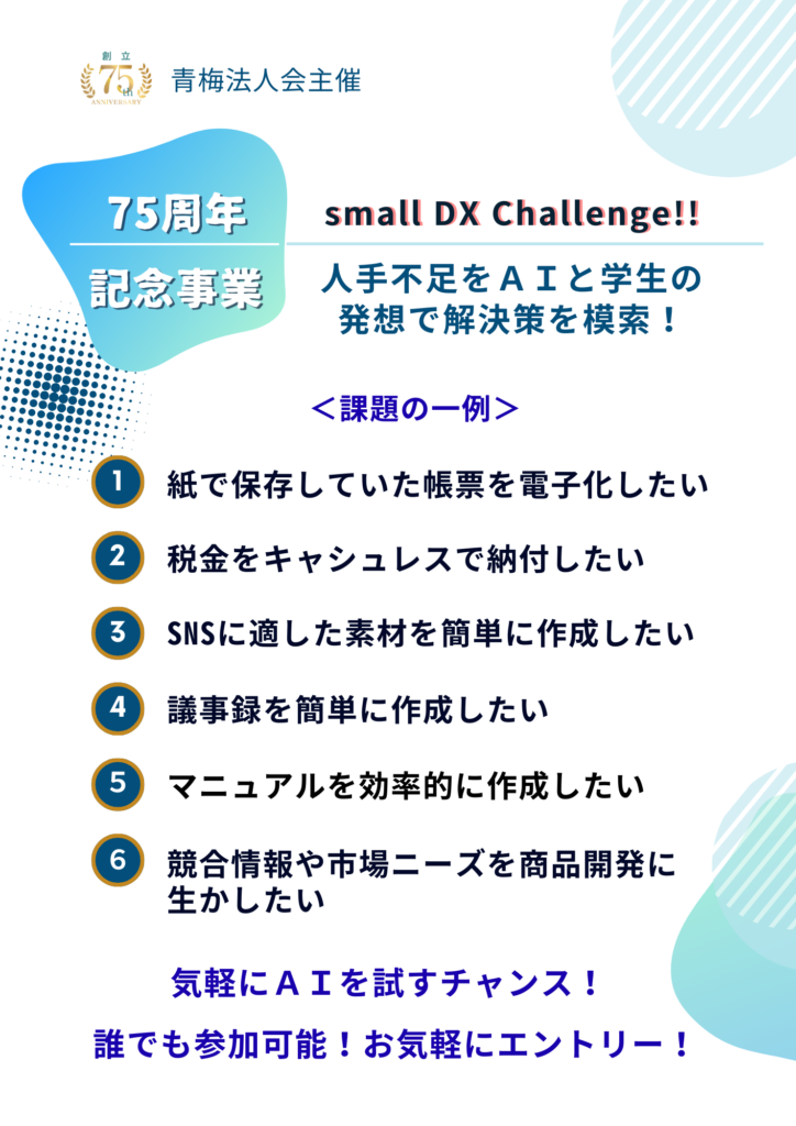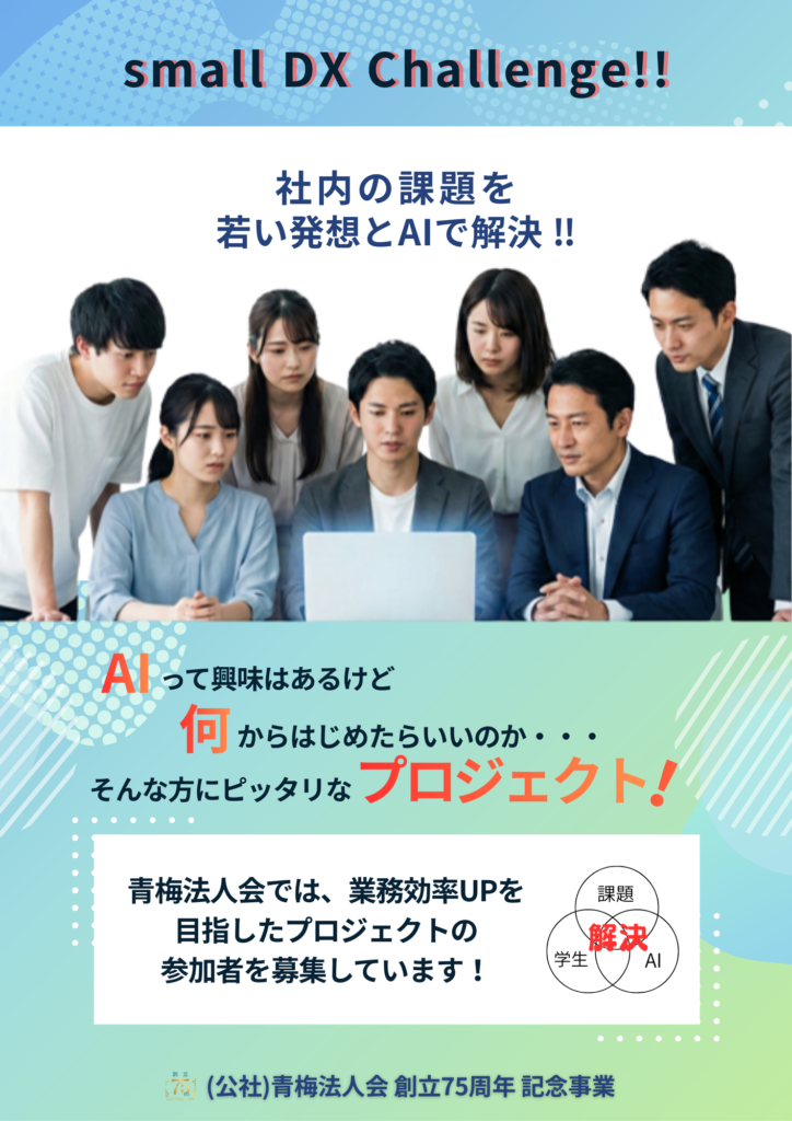 「企業の課題」を「学生」の発想と「AI」を活用して解決策を模索し省力化、省人化を図る「small DX Challenge」がいよいよ始動します!